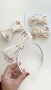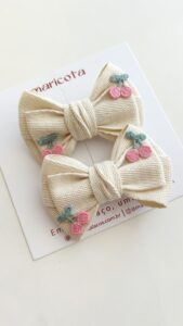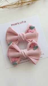 Par laço Celina confeccionado em fita de algodão com aplique cerejinha.