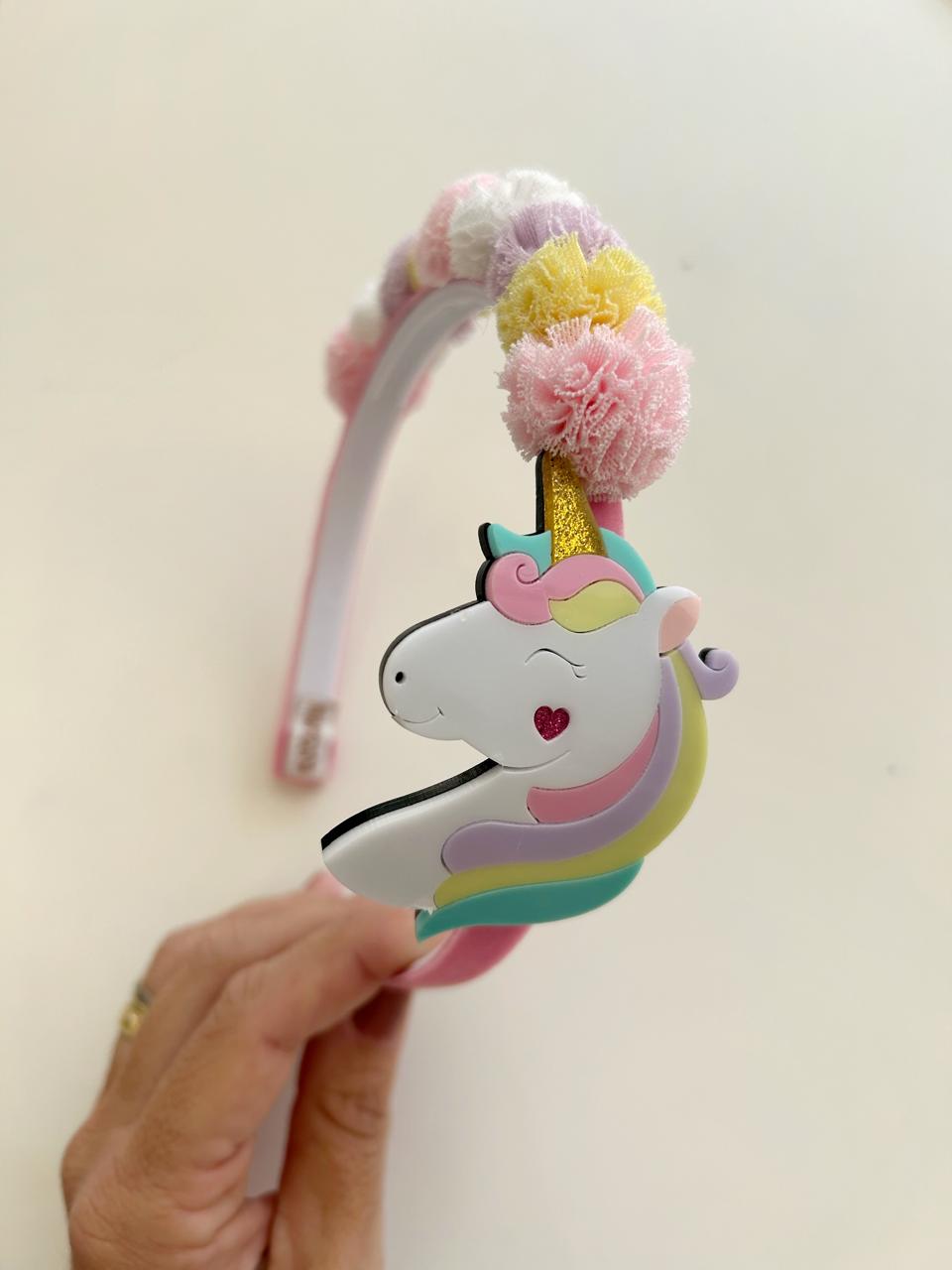 Com pompons de malha e com aplique de acrílico Unicórnio